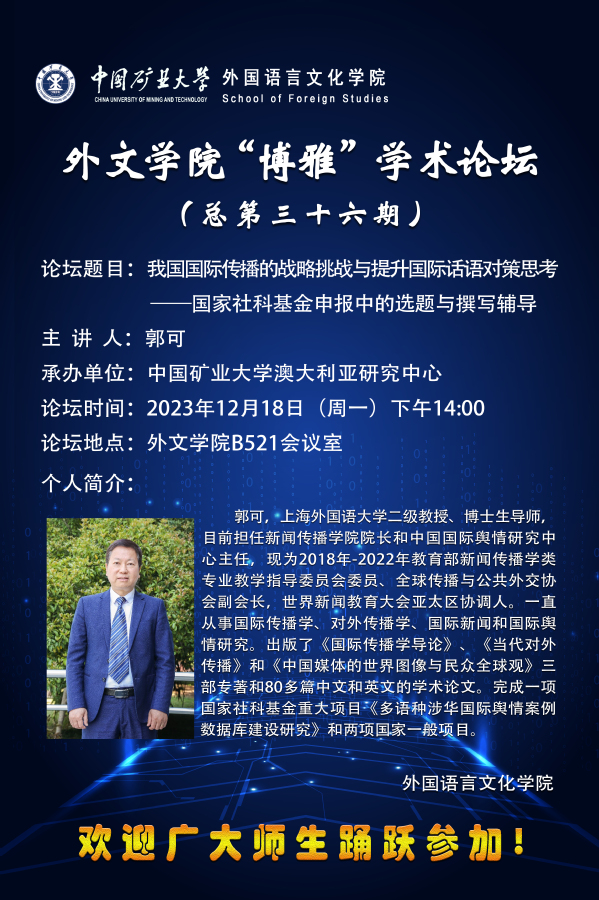 太阳成“博雅”学术论坛(总第三十六期)我国国际传播的战略挑战与提升国际话语对策思考——国家社科基金申报中的选题与撰写辅导