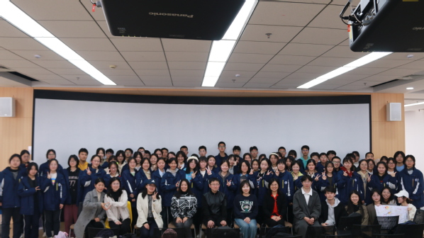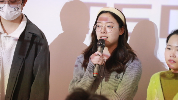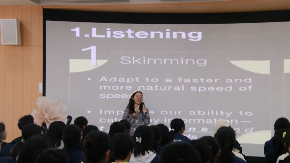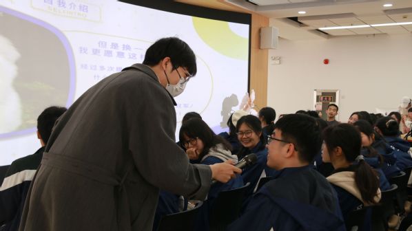 第一个环节是学长学姐演讲。高岩、刘莹莹、黄子腾、李雨薇四位学长学姐为大家解答关于高中英语学习、大学选科与发展方向、大学英语学习等问题。刘莹莹分别从听力、口语、阅读和写作进行经验分享。在听力练习方面,她分享了精听和略听两大方法,并推荐同学们利用BBC和TED进行听力练习;在阅读方面她推荐同学们深入阅读去理解英语的思维模式,分析长难句的句子结构并积累词汇;写作方面更倾向于多写并建立自己的写作语料库;最后在发言方面则鼓励大家抓住表达自己的机会,勇于尝试。高岩学姐从自己的科研经历出发,结合当代人工智能技术的发展,为同学们生动阐释了在新时代精通英语的必要性。演讲之后,矿大附中的同学们踊跃举手发言、提问,学长学姐们耐心细致地给出解答。