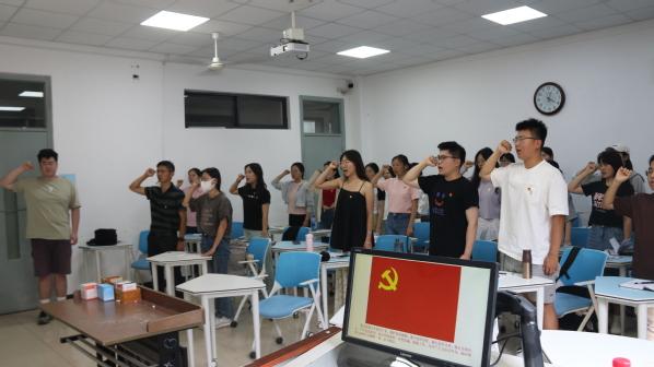 授课结束后,与会党员面向党旗重温入党誓词。