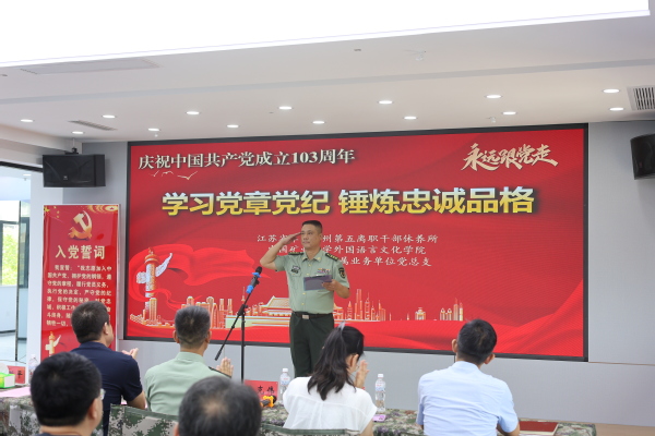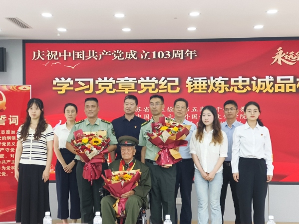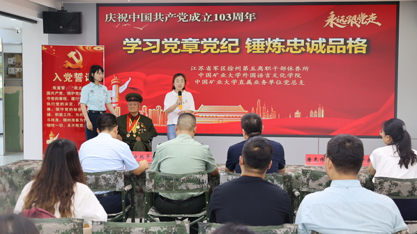 为迎接中国共产党成立103周年,推动党纪学习教育走深走实、入脑入心,6月28日上午,太阳成与校直属业务单位,联合江苏省军区徐州第五离职干部休养所共同举办“学习党章党纪、锤炼忠诚品格”“七一”主题党日活动。参加过抗美援朝战争、荣获朝鲜三级国旗勋章、荣立三等功二次的98岁的离休老干部孙金波,太阳成党委书记张向东、副书记朱正中及部分学生党员代表,校直属业务单位党总支书记方跃平、副书记尹良伟及部分教职工,江苏省军区徐州第五离职干部休养所所长李新胜、政委唐克伟及部分官兵参加活动。唐克伟主持活动。
