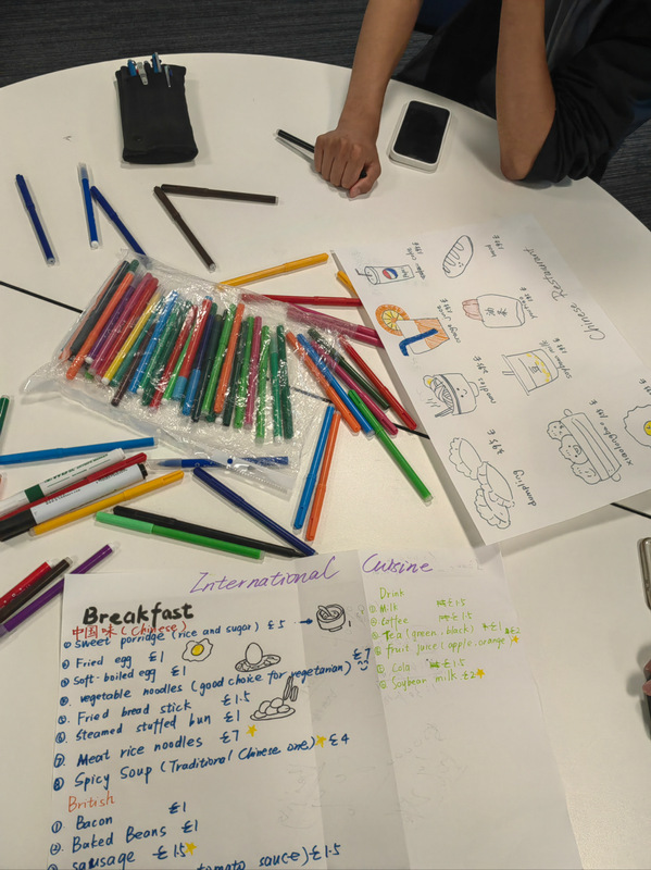 在此之后,老师要求大家设计属于自己的菜单。在这个过程中,同学们不仅将刚刚品尝的英式早餐元素融入其中,还结合了家乡的传统食物。例如,有的同学将中式的粥、豆浆与油条纳入了菜单。过程中我们也认识了一些其他国家的美食,对食物的多样性有了更深刻的认识。