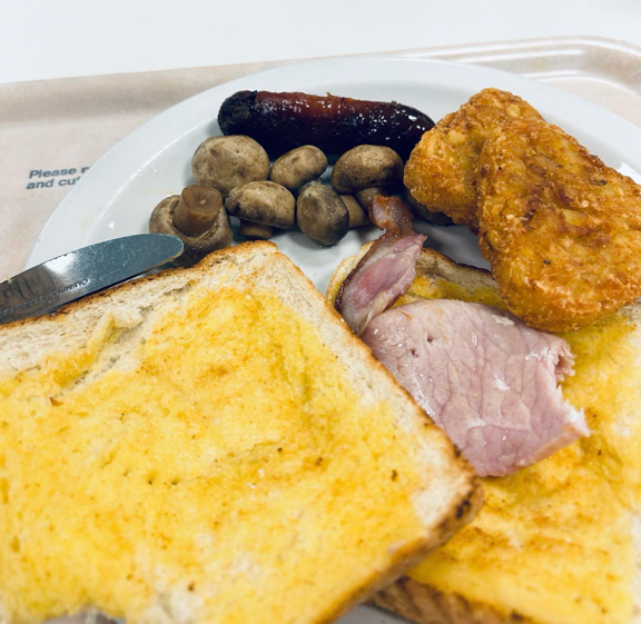 在此之后实习团的成员们按照课程集体前往中央兰开夏大学的校园餐厅,体验了一次正宗的英式早餐。这一餐不仅是对英国传统饮食文化的一次深度体验,也成为了大家放松心情的一个契机。餐桌上,烤面包、培根、香肠、煎蛋、焗豆等传统英式早餐食材一一呈现。每样食材都有自己独特的品尝体验,培根的烟熏味道,香肠的多汁口感以及蘑菇的独特风味,同学们体验到了截然不同的味觉感受。