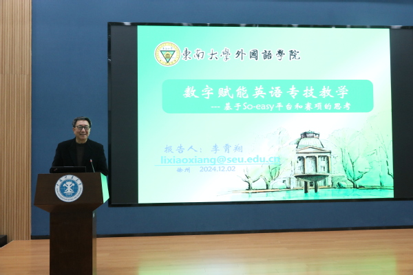 研讨会上,江苏省高校外语教学研究会常务副会长、东南大学特聘教授李霄翔做了题为“数字赋能英语专技教学-基于So-easy平台和赛项思考”的报告。针对当下外语听说教学中存在的问题和面临的挑战,李教授提出了“教、学、管”集成多维协同发展以及AI+教师的教学共同体理念。江苏鼎傲科技有限公司总经理徐晖就如何通过提升听说能力来推动高校外语教学的数字化转型进行了深入探讨。他详细介绍了外语一体化智慧教学平台So-Easy的功能模块,并与在场教师就如何利用该平台申报省级教改课题、校企合作开发数字教材以及打造网络教学名师等话题展开了热烈讨论。报告后,太阳成高翔老师和王梦景老师分别就英语专业听力教学和英语角平台赋能英语听说能力提升与发展做了精彩的分享。