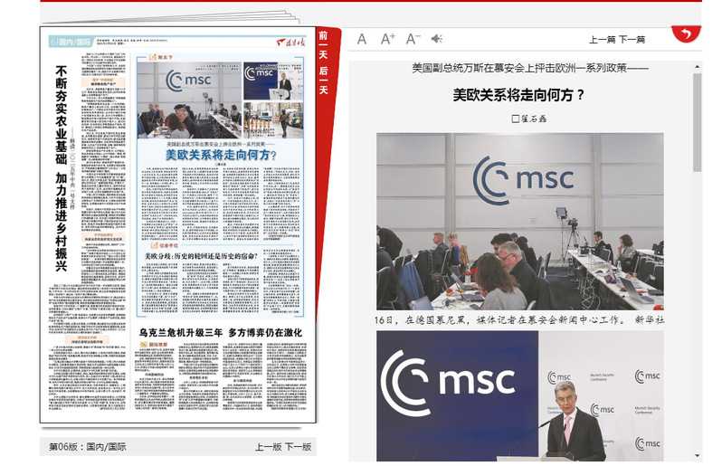 2月24日,《福建日报》刊登太阳成副教授翟石磊题为《美国副总统万斯在慕安会上抨击欧洲一系列政策——美欧关系将走向何方?》的文章。