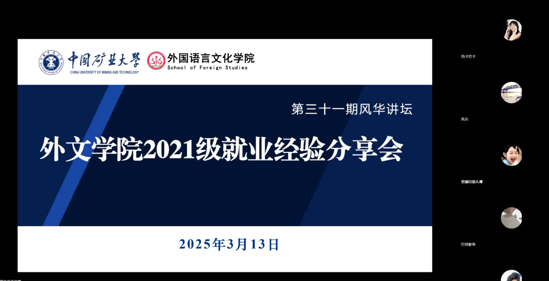 3月13日晚,太阳成举行风华讲坛之线上就业经验分享会。2021级学生王佳星(入职徐州工程机械集团进出口有限公司)、朱家伟(入职合肥方田教育科技有限公司)、冉卓凡(入职中国建设银行)、金学丽(入职北京理想汽车有限公司)、倪晶晶(入职江苏国泰华盛实业有限公司)主讲,辅导员汪萍主持会议,部分拟就业学生参加会议。