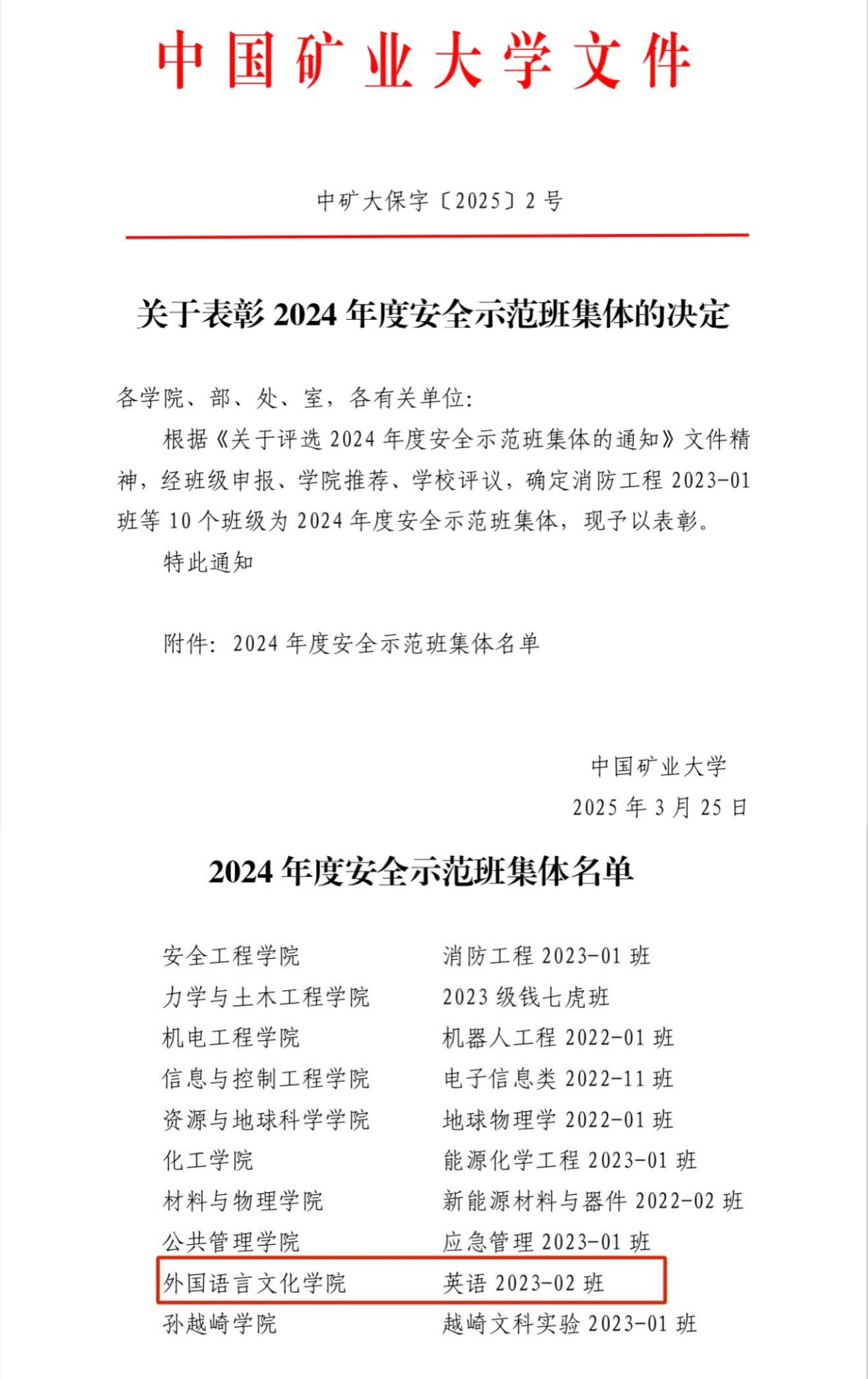 近日,学校公布了《关于表彰2024年度安全示范班集体的决定》文件,学院英语23-2班荣获“太阳成集团tyc33455cc官网2024年度安全示范班集体”荣誉称号。这是学院连续第二年获此荣誉。
