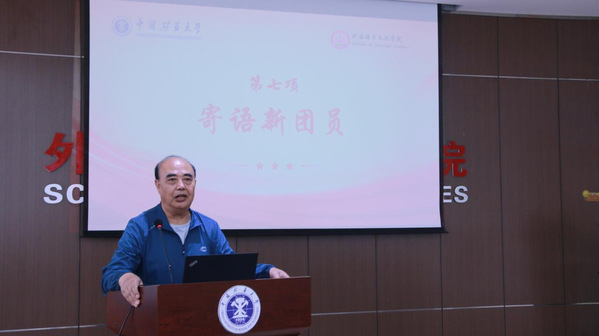 朱正中做总结讲话。他对新团员提出要求,一要筑牢信仰根基,做头脑清醒的外文人;二要练好专业本领,做讲好中国故事的外文人;三要脚踏实地奋斗,做知行合一的外文人。他勉励大家珍惜团员身份,努力成为“眼里有光、心里有爱、脚下有力、肩上有责”的新时代青年。