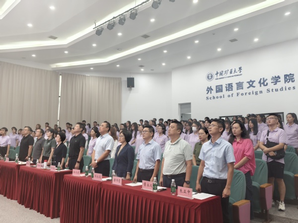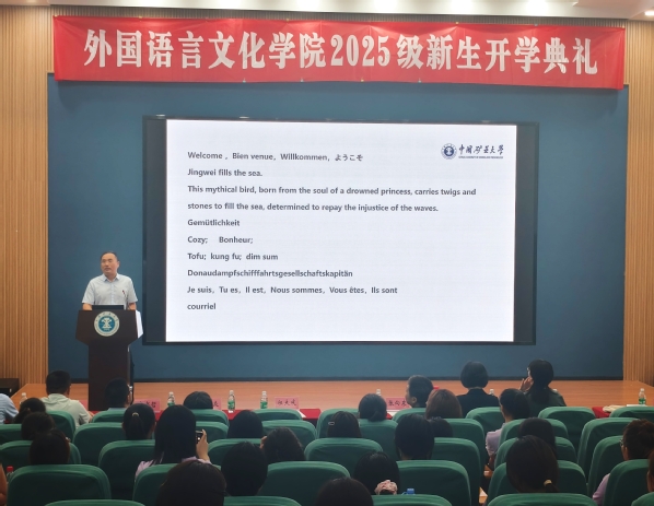 典礼在庄严的国歌声中拉开帷幕。祖大庆代表学院向55名硕士研究生和131名本科生表示热烈欢迎。他指出,语言不仅是单词与语法的组合,更是一套“文化操作系统”,承载着不同民族的思维方式和精神内核。面对人工智能技术的快速发展,外语学习者具备不可替代的文化理解与阐释能力,能够传递文字背后的精神与情感,这是机器翻译无法触及的深层文化维度。他鼓励同学们保持好奇心、钝感力与平常心,在语言学习中既追求精准表达,也拥抱文化多元性,真正成为连接中外的桥梁。最后,他以易卜生的名言勉励新生——“人生最大的责任就是把你自己塑造成器”,期待同学们在太阳成成长为有视野、有深度、有温度的新时代外语人才。