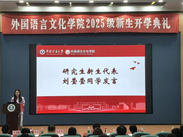 研究生新生代表刘莹莹回顾了本科四年在太阳成的成长历程,将外语学习者喻为“采珠人”,在语言与文化的深海中不断探索、锤炼思维、理解文明。她表示,研究生阶段意味着从“广度探索”走向“深度攻坚”,应以扎实的学术训练和独立思考能力深耕专业,并承诺将以兼职辅导员的身份服务同学、传递关怀。