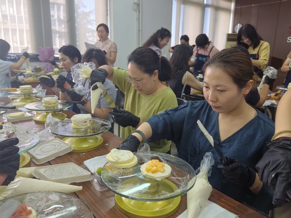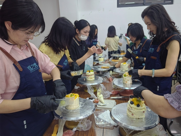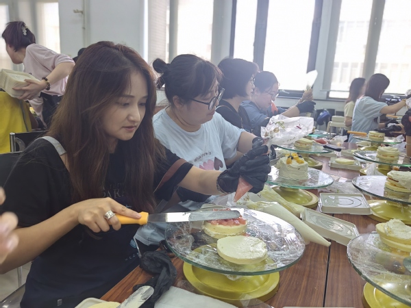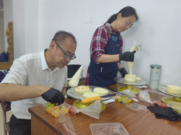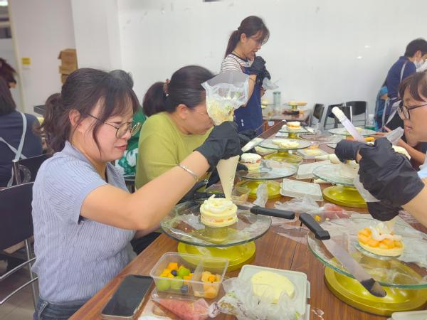 副院长刘婷婷代表学院致辞,向辛勤耕耘在教学、科研和管理服务一线的全体教师致以节日的热烈祝贺和诚挚问候。在糕点师傅的指导下,老师们纷纷动手实践,兴致盎然地投入到奶油涂抹、裱花装饰与水果摆放等环节中。现场气氛温馨热烈,欢声笑语不绝于耳。经过近一个小时的精心制作,一批造型别致、创意十足的蛋糕陆续完成。
