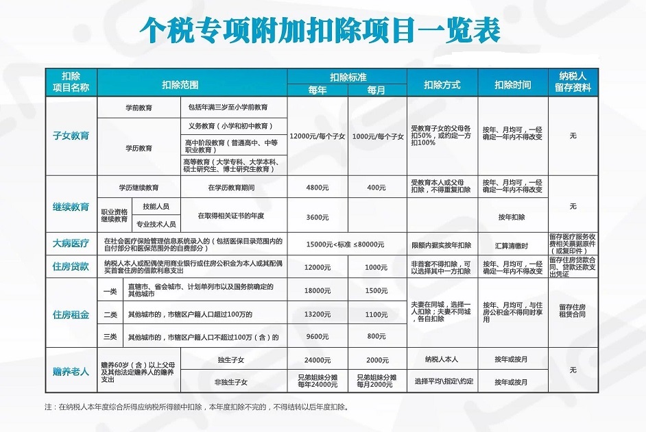 个人所得税法规定的子女教育、继续教育、大病医疗、住房贷款利息、住房租金和赡养老人等六项可在申报纳税时按规定标准予以税前扣除。具体情况见下表: