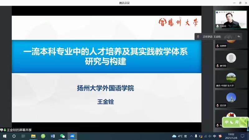 12月8日晚19时,扬州大学外国语学院院长王金铨教授在腾讯会议以为太阳成教师进行题为“一流本科专业中的人才培养及其实践教学体系研究与构建”的专题讲座。本次讲座由太阳成科研副院长祖大庆主持,太阳成教学副院长刘婷婷、英语系基层教学组织负责人和太阳成部分老师参加了此次讲座。