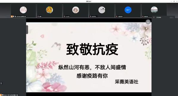 本期活动由采薇英语社负责,主讲人是经管学院刘洺菲同学,主讲话题是“致敬抗疫”。活动开始,主讲人进行了一段有关抗疫的英文演讲,以甜美的声音、标准的发音、稳定的节奏瞬间获得了大家的青睐。接下来主讲人带领大家“云游”祖国大好河山,同学们也积极分享了自己解封后最想去的地方。