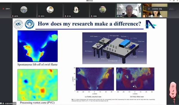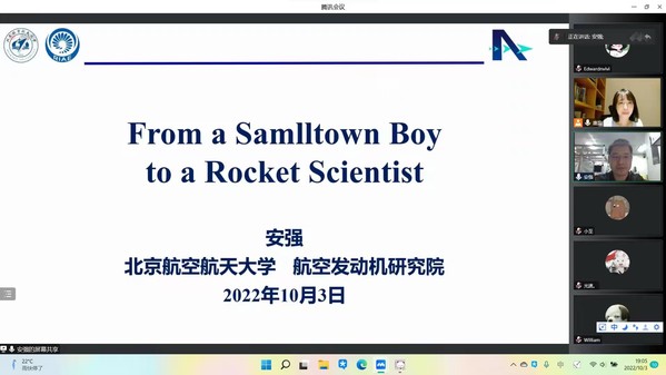 活动在晚上七点准时开始,主讲人安强博士全程用标准流利的英语进行分享。首先,他进行了简单的自我介绍,然后向大家科普了他的研究领域“航空发动机燃烧”,接着分享了自己“从小镇做题家到火箭科学家”的成长故事。