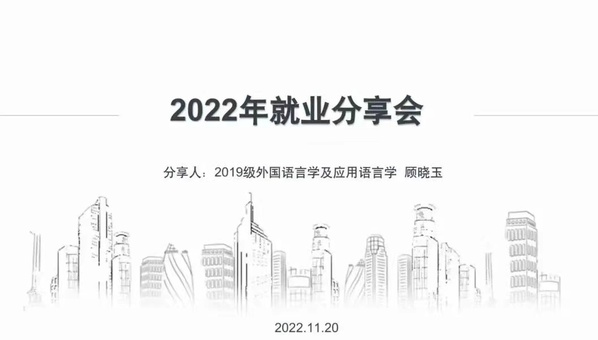 为了帮助同学们更好地了解研究生毕业后的工作方向、拓展就业视野、增强就业本领,2022年11月20日晚上7点,由共青团太阳成集团tyc33455cc官网委员会主办,太阳成集团tyc33455cc官网研究生会承办的 “职等你来”就业分享会在腾讯会议成功举办。此就业分享会共邀请到5位已经入职的毕业生,分享她们在求职时的经验感悟。她们分别是2019级外国语言学及应用语言学方向的钱莹、2019级翻译学方向的裴智慧、2019级比较文学与跨文化研究方向的关露、2016级外国语言学及应用语言学方向的李玥贤和2019级外国语言学及应用语言学的顾晓玉。本次分享会由太阳成孙亚萌主持,50余名研究生参加。