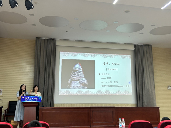 活动伊始,志愿者们为每个孩子提供了单词手卡,帮助孩子们在游览中记忆,在记忆中感受。在汉兵马俑博物馆中,讲解员带大家领略汉朝的军事风采,兵士俑们姿态各异、栩栩如生,正威严列阵、似蓄势待发。在活动体验区,小学生们体验了投壶、射箭的装备,让孩子们体验了一把“君子之艺”。临湖廊榭蔓回曲折,一面临景另一面置汉画石,石画线条刀刻斧凿,深深浅浅,明暗交织,诉说只有时光能听懂的故事。在汉文化大讲堂,汉学老师向大家普及了汉代礼仪知识,孩子们向老师行天揖礼,老师回土揖礼,一来一往,牵连起情谊,交织成传承的信念。随后,志愿者代表通过“词根/词缀+联想记忆法,向孩子们讲解了汉文化相关英语词汇,引导孩子们将单词放入一定的语言环境,结合句意,高效记忆英语词汇。在参观过程中,志愿者们也同时采集景区不规范的标识翻译,以期规范徐州汉文化景区的标识翻译。