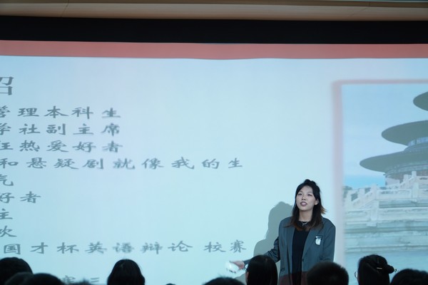 四位优秀学姐分享了各自的英语学习心路历程。经济管理学院张梦琪同学讲述了在阳光英语学社的工作经历,分享了参加英语竞赛的经验,并寄语学弟学妹:兴趣和热爱是学好一门语言的两大关键。